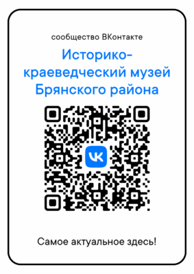 В сообществе ВКонтакте Историко-краеведческого музея Брянского района вы можете узнать информацию о передвижных выставках художников и народных мастеров Брянского района и Брянской области, о проходящих мероприятиях музея, а также будете в курсе самых актуальных новостей и событий, происходящих в историко-краеведческом музее Брянского района и на территории Брянского района.